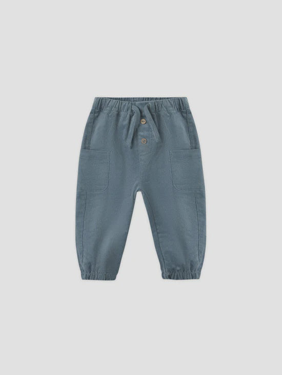 Comfortable corduroy pants with an elastic waistband and leg openings, adjustable drawstring, and side patch pockets.