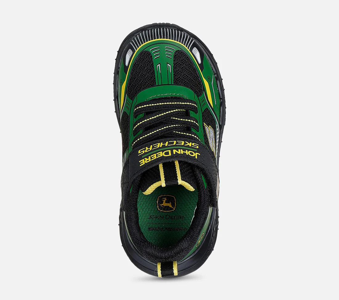 Get ready for outdoor adventures wearing Skechers x John Deere: Skech Tracks - Tractor-Tronix! This lightweight sneaker features a John Deere tractor inspired silhouette, synthetic and mesh upper with stretch laces, Skechers adaptive closure and a cushioned Skechers Air-Cooled Memory...